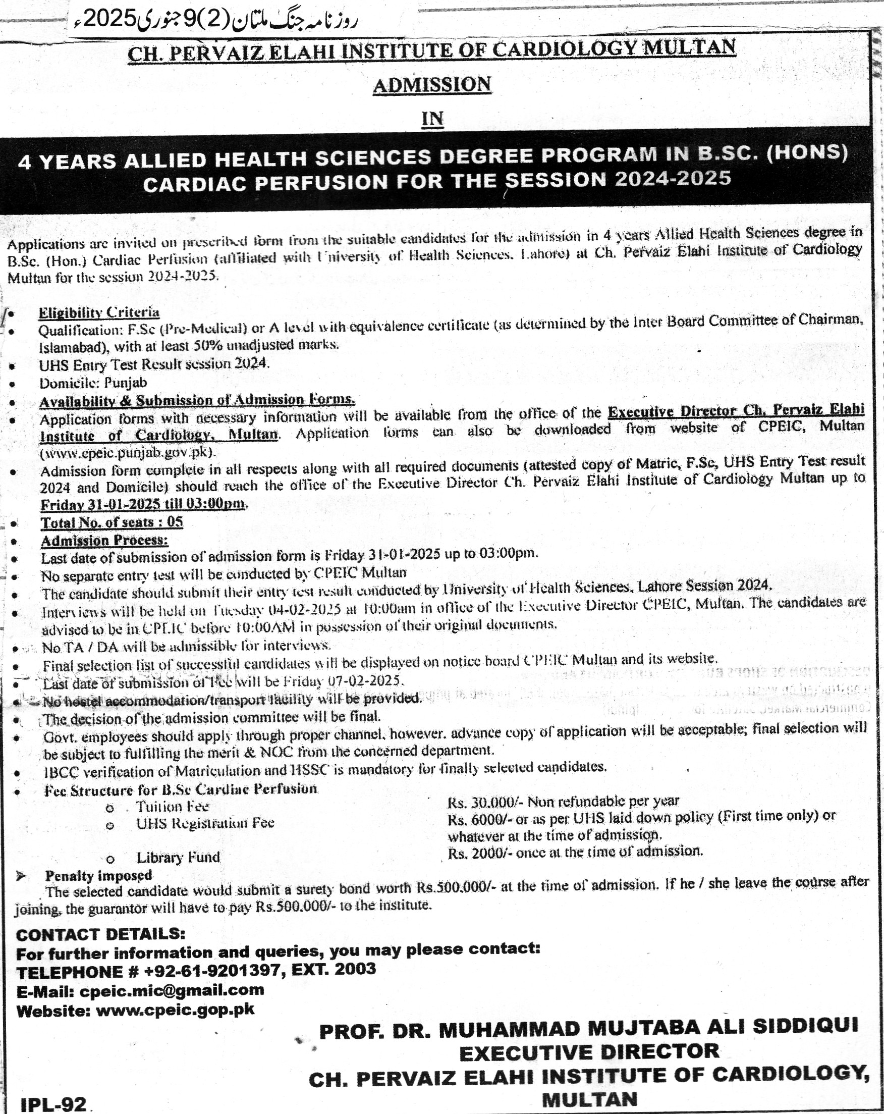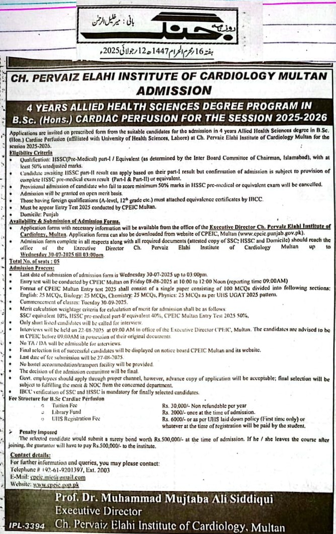 | Advertisement & Form for the admissions in B.Sc(Hons) Cardiac Perfusion for the Session 2025-26 at CPEIC Multan |