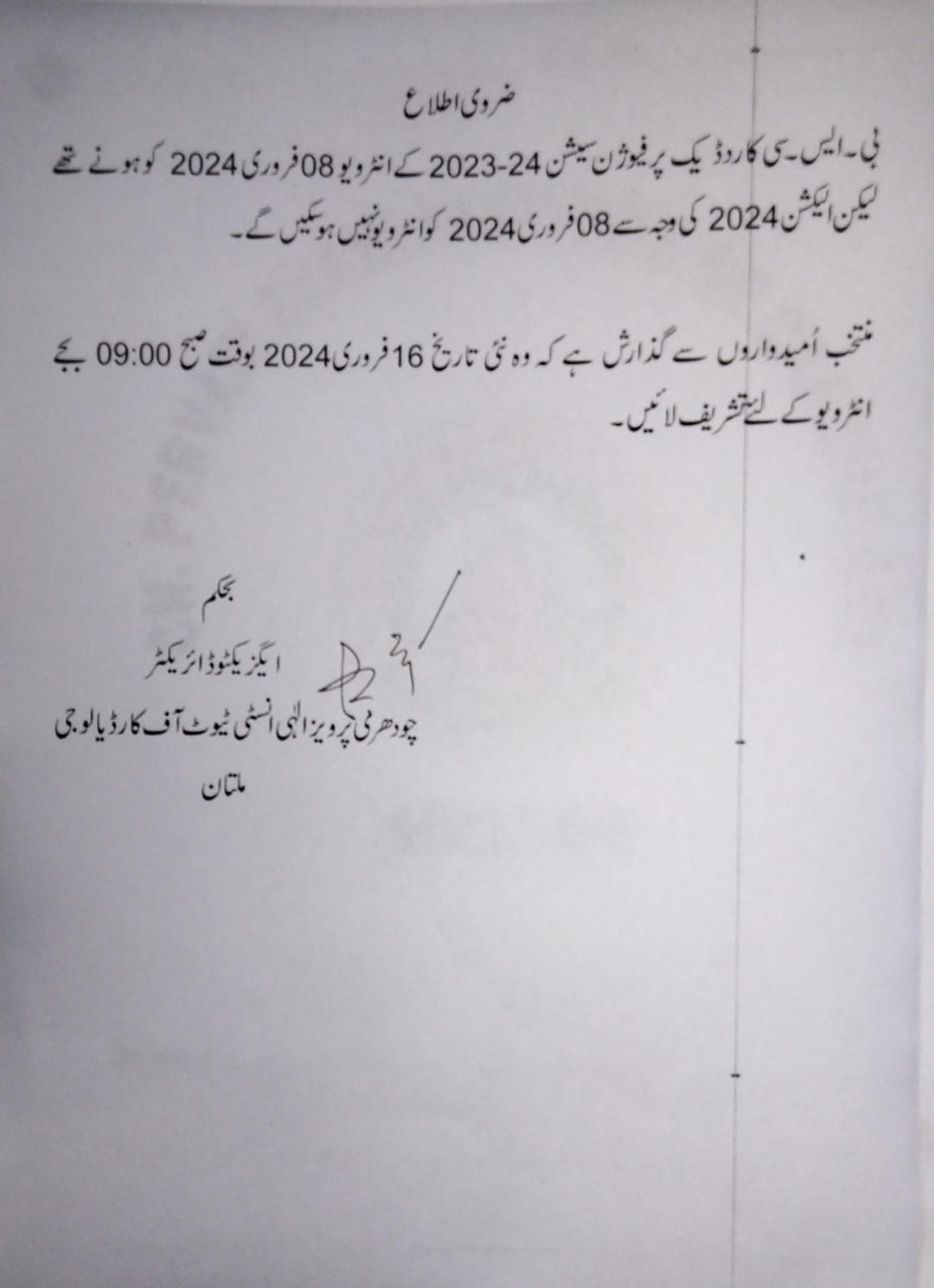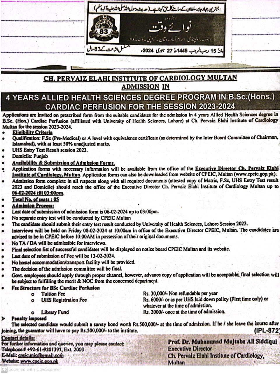 | Advertisement & Form for the admissions in B.Sc(Hons) Cardiac Perfusion for the Session 2024-25 at CPEIC Multan |