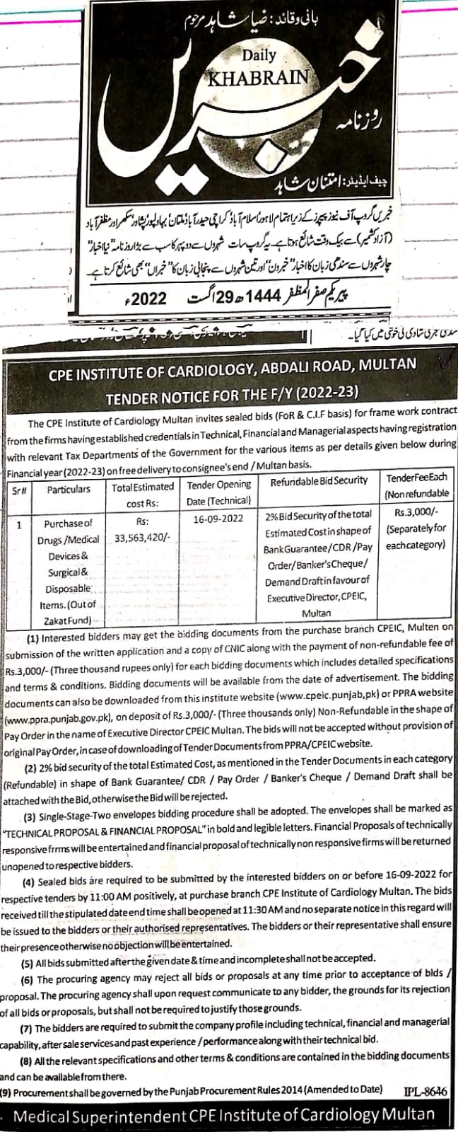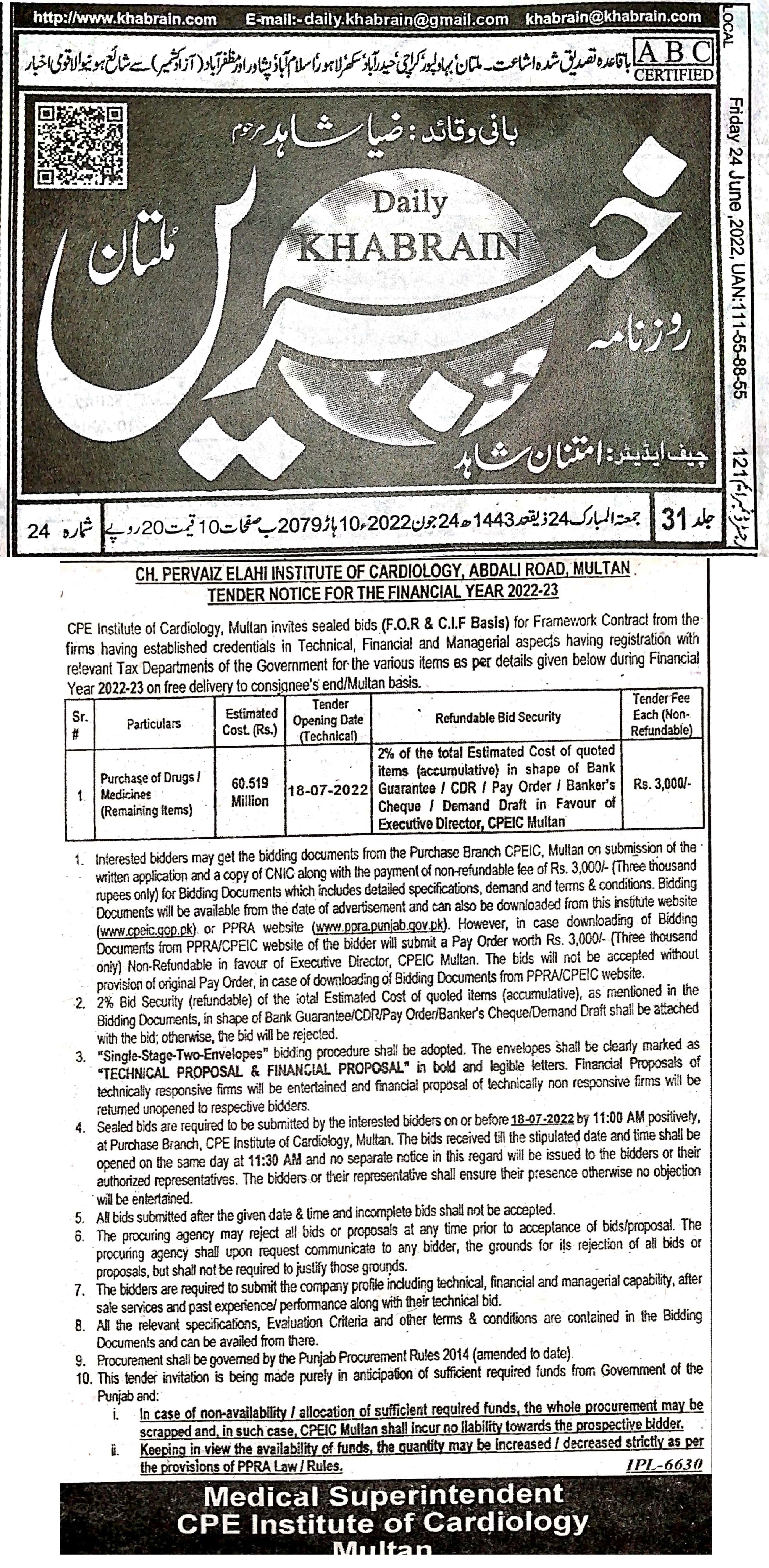 | Tender Advertisement for the Purchase of Drugs/Medical Devices and Surgical Disposable Items (Out of Zakat Fund) for the F.Y 2022-23 |